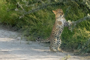 Nach zwei Nächt i de Oberland Lodge und Voll-Inclusive isches zrugg uf de Camping gange. Dass mer wider diräkt im Park gsi sind hemmer gnutzt und sind be Sunneufgang los. De Linda ihri Usduur bem Tier spotte hed sich uszahlt. Trotz höchst aspruchsvolle Verhältniss hed sie nach 2.5 Stund die zweiti Wildchatz in freier Wildbahn gsichtet – Leopard ✅ sogar mit emene Jungtier im Schlepptau. Uf ere ganz eisame Strass sinds über 5min vor üs her gloffe.