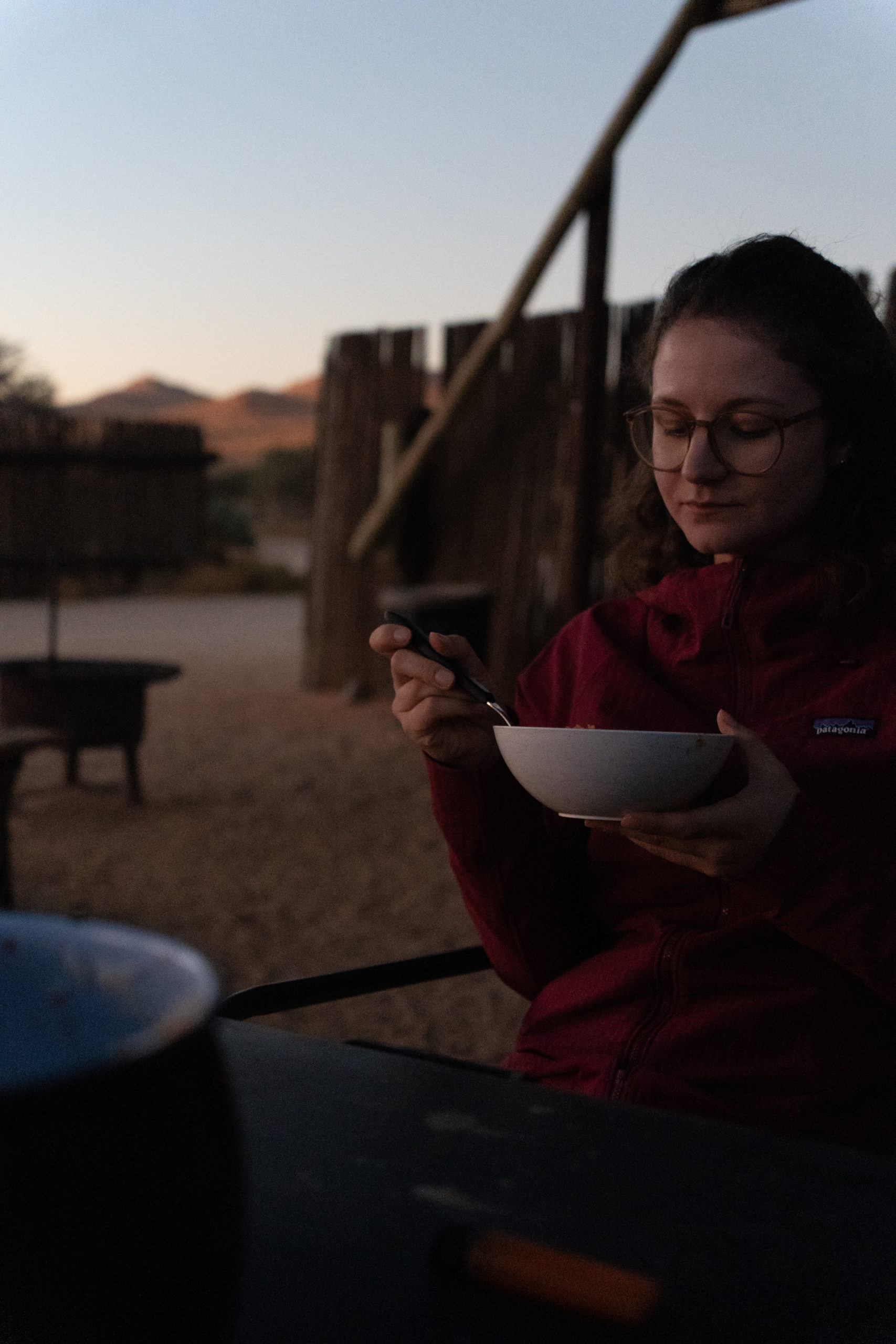 Ih de Regel simmer au ohni Wecker spötistens am 6i wach, denn wenn sich de Himmel schön rot fad afo verfärbe. Meistens chömmer s Spektakel vom Sunneufgang sogar diräkt us em Zält mitverfolge. Und well de Himmel fast immer wolkelos isch, sind au d Sunneuntergäng immer sehr schön. Mit em Fötele hemmers aber langsam ufgeh, well d Kamera die schöne Farbe eifach ned richtig ifangt 🙁 Au de schön Sternehimmel hemmer gester Abig versuecht festzhalte. Üsi Caminingnachbare hend aber chli z starchi Lampe gha…