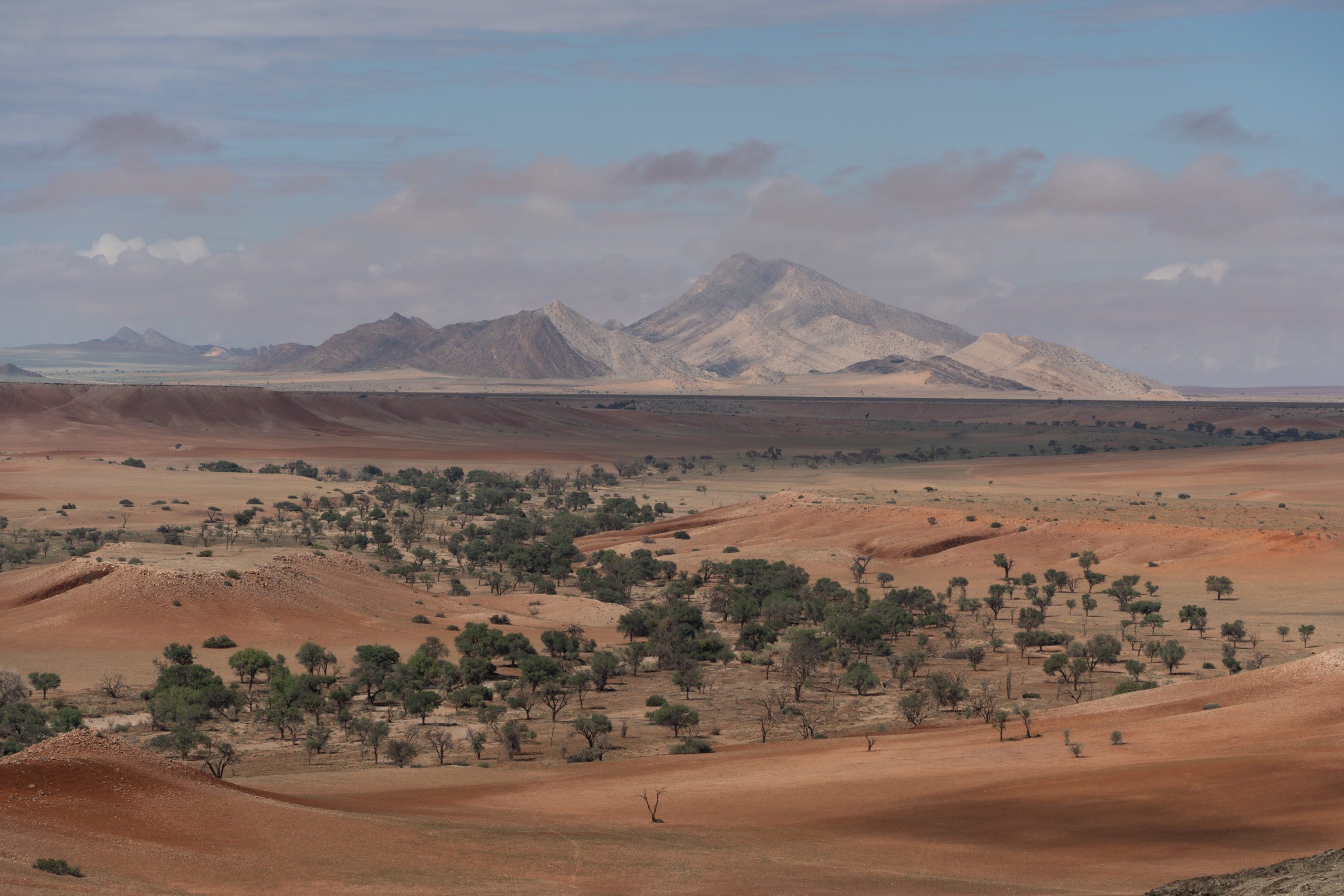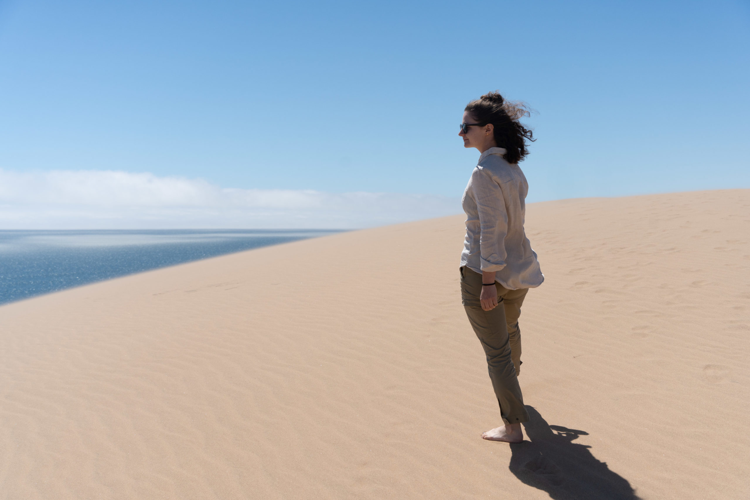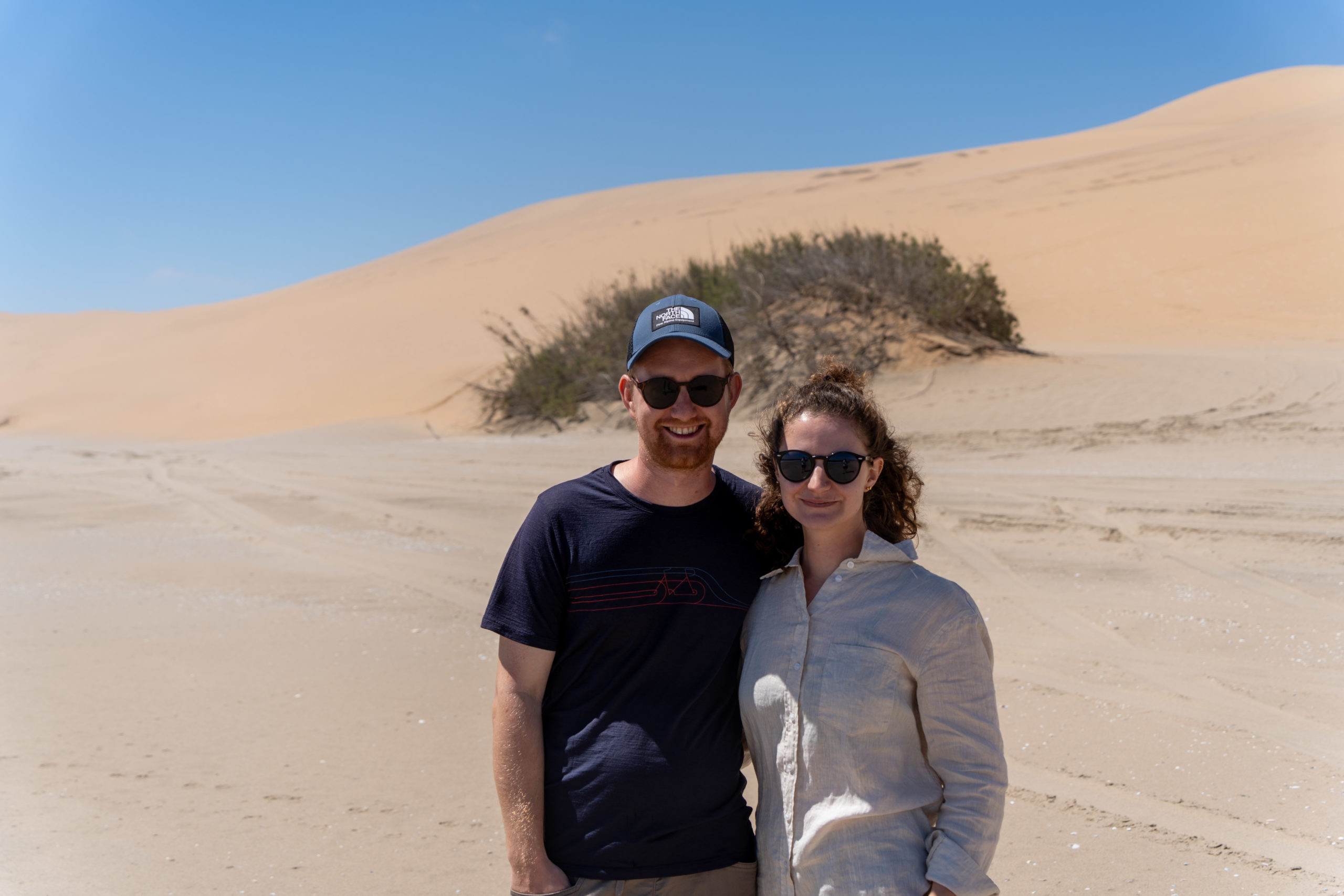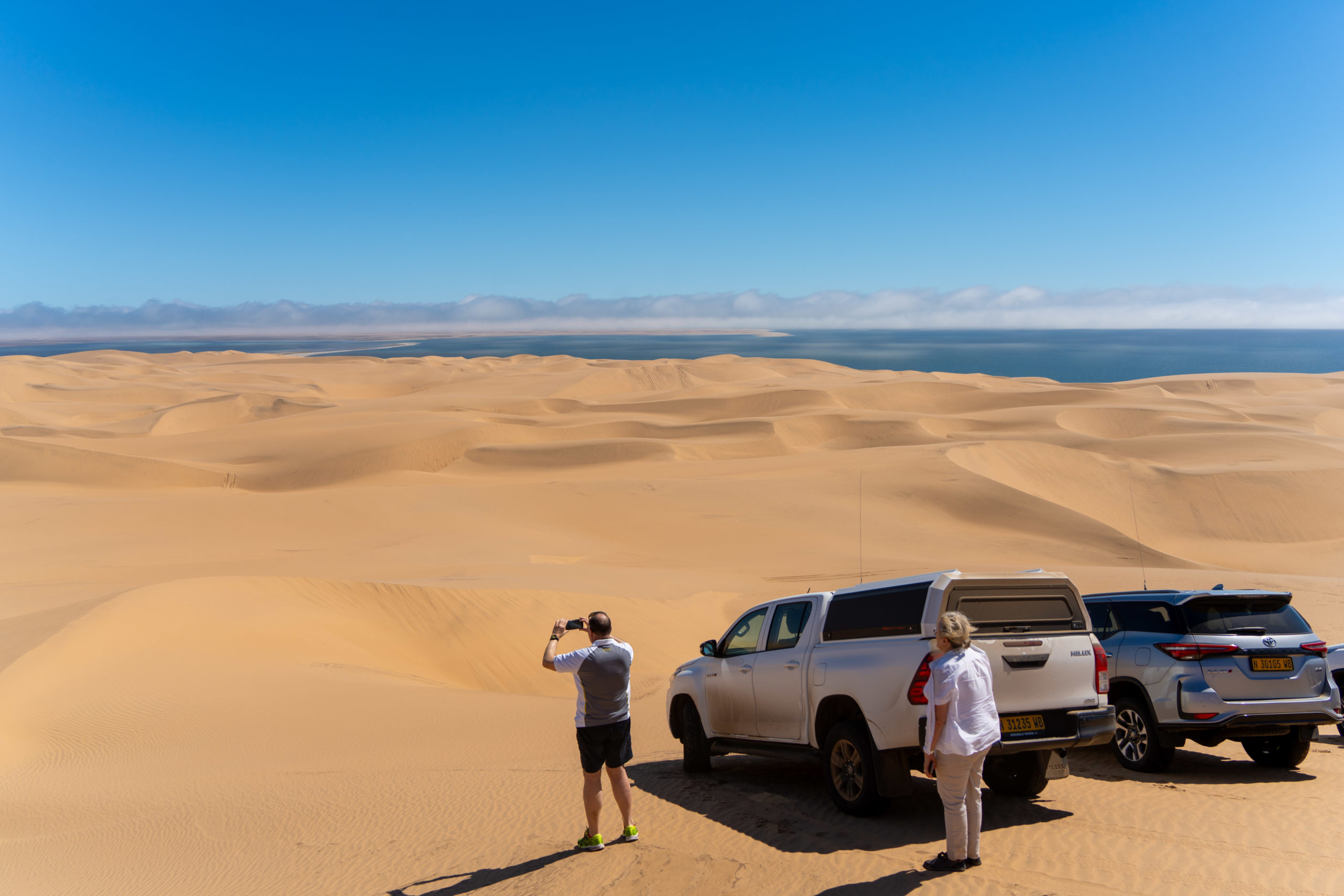 Am Morge isch d’Sunne leider ned fürecho und s’isch sehr näblig gsi. D’Robbe hemmer trotzdem gseh (die chamer ned überseh, es sind sooo viel) und au es paar Delfine sind ah üs verbigschwumme. Au drü Pelikan hend üs ufm Boot bsuecht (sie sind hald gfüetered worde ;)) und sogar en Buckelwal gemmer gseh. Das seig eher sälte und drum isch sogar d’Crew fast ächli nervös gsi. Nach de Bootstour simmer scho vom nächste Guide für d‘ Dünefahrt abgholt worde. Lustigerwiis simmer mitm Guy vo Frankriich und sinnere Frau im Auto gsi, genau wie be üsem allererste Usflug ih üsere erste Unterkunft ide Kalahariwüesti 😉 Mer sind rund 200km dur d’Dünelandschaft gfahre und hend oft döffe usstiege zum d’Landschaft bewundere und Föteli mache. S’Highlight für d’Guides isch, dass sie jede Tag en andere Wäg dür d’Düne müend sueche und anderi Ussichtspünkt astüred, well sich d’Dünelandschaft immer wieder verändered. Ufgrund vom füechte Sand hemmer nochli steileri Uf- und Abbstieg chönne mache. Alles ih allem simmer au vo dere Touritour positiv überrascht gsi.