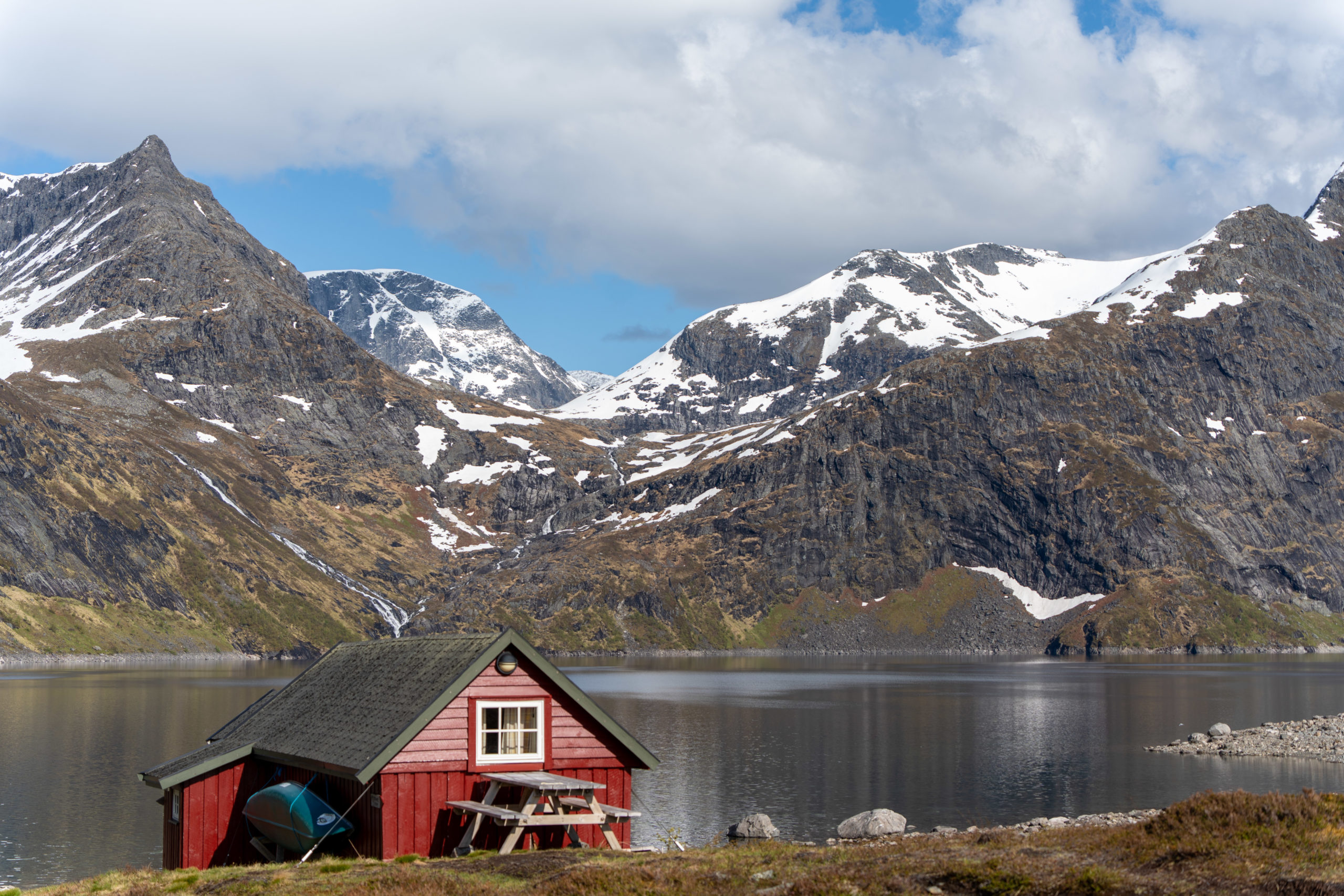 De einzig Sunnetag (31.05.) hemmer voll welle usnütze und sind uf Bjørke gfahre. Vo det hemmer en wunderschöni Wanderig zu de DNT Hütte Tyssenaustet gmacht. DNT Hütte ide Berge sind da immer unbewarted im Gägesatz zu de SAC Hütte wo mier känned. D’Hütte liid idyllisch amene See zwüsche vielne Berggipfel. Sie isch für sächs Persone, aber mer hend sie für üs allei gha 🙂 Mer hend uf de Bänkli vor de Hütte gläse und gässe und d’Sunne und die schön Lag gnosse. D’Übernachtig isch bequem aber ächli früsch gsi.